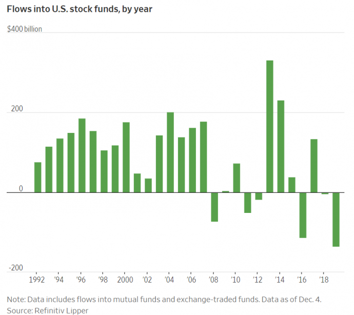 The Wall Street Journal сегодня пишет, что S&P 500 показывает свой лучший рост за шесть лет в этом году, но отдельные инвесторы бегут из фондов акций самыми быстрыми темпами за последние десятилетия.