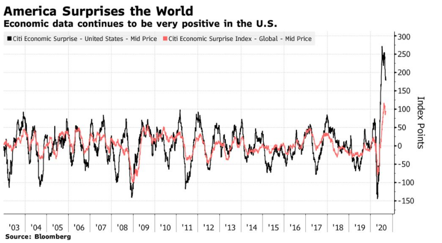 Также стоит не преувеличивать реакцию рынка. Никакие тренды не изменились, и активность в течение дня заседания ФРС была спокойной. Причина, по которой ФРС, вероятно, останется в рамках ожиданий, была хорошо известна заранее и положительна для рынка: экономические данные в целом были на удивление хорошими, и это затрудняет оправдание даже более значительной денежной помощи, особенно на последнем заседании перед выборами президента. Индексы Citi Economic Surprise по-прежнему показывают, что данные из США намного опережают ожидания и в гораздо большей степени, чем данные по остальному миру: