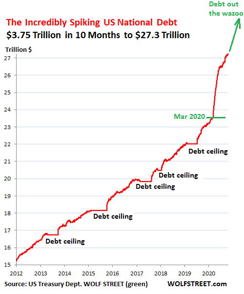 В текущем году произошёл невероятно резкий рост государственного долга США, который с 1 марта вырос на 3,75 триллиона долларов благодаря стимулированию и финансовой помощи, и на 4,2 триллиона долларов за последние 12 месяцев до 27,3 триллиона долларов. Триллионы разлетаются так быстро, что их трудно даже увидеть. Но это все ценные бумаги казначейства, и кто-то их должен был купить.