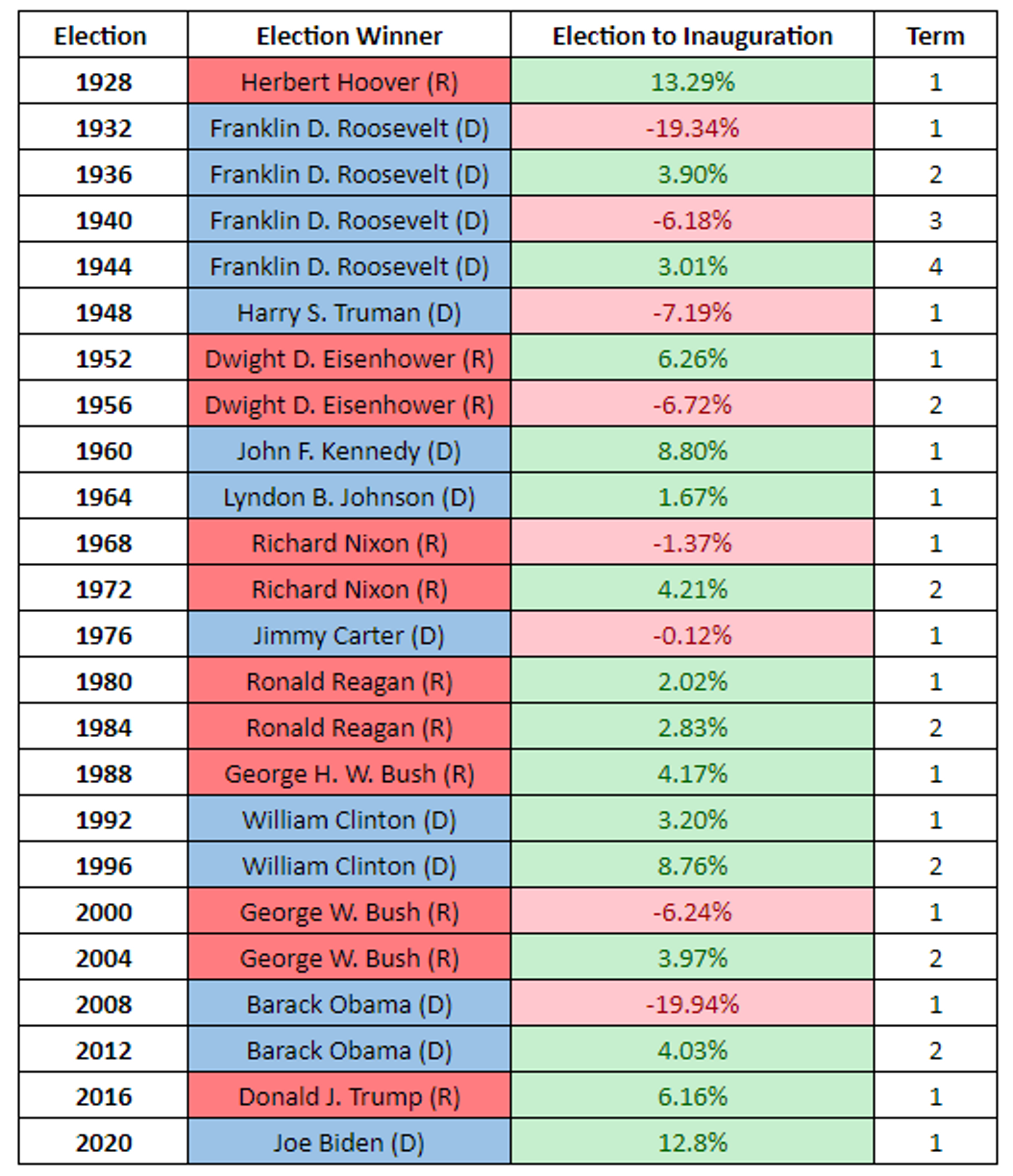 Абсолютным чемпионом по показателям от Дня выборов до Дня инаугурации был президент-республиканец Герберт Гувер с ростом индекса S&P 500 SPX на 13,3% между его избранием 6 ноября 1928 г. и первым днем его пребывания в должности.