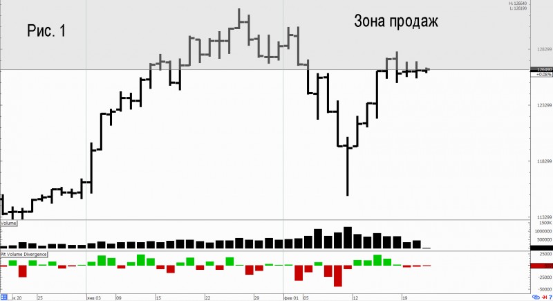 На дневке видно, что мы входим в сильную зону продаж (рис. 1). Самые нетерпеливые уже вовсю начинают шортить фьюч. Вроде бы логично на первый взгляд, но! С 2016 года идет восходящий тренд. То есть, шорт - это игра против летящего на вас локомотива. Это не хорошо и не плохо. Просто надо это понимать и строить свой план в соответствии с работой против тренда.