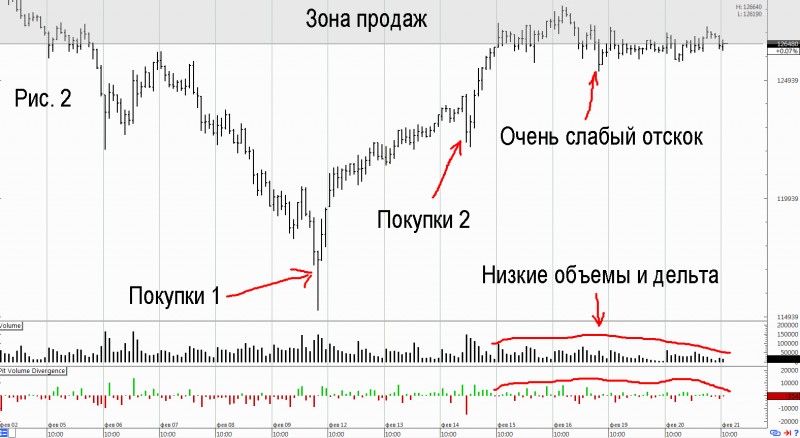 Но что мы видим?! Несколько дней цена как бы прилипла к зоне продаж. Даже нормального отскока не произошло. Смотрим на объемы торгов - они пониженные. Смотрим на индикатор маркет-дельту - тоже ничего необычного. Продавец себя не проявляет или его попросту нет на этом уровне. Поэтому сейчас шортить от данной зоны продаж - сверх рискованное занятие.
