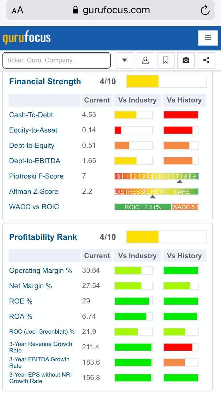 GuruFocus — это прекрасный сервис, которые оценивает компанию сразу по куче методик, сравнивает ее со справедливой стоимостью, смотрит по отношению к сектору, смотрит на фин. показатели за предыдущие годы и тд.