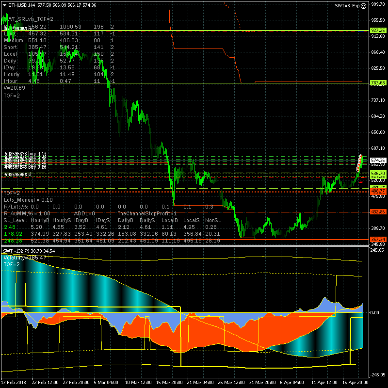 Робот погряз в покупках эфира со среднесрочной целью в зоне уровня сопротивления 927.25. Позиции трейлингуются с параметром волатильности V (цифровой индикатор в левом верхнем углу графика) и на откатах прибыльные сделки закрываются трейлинг-стопом.