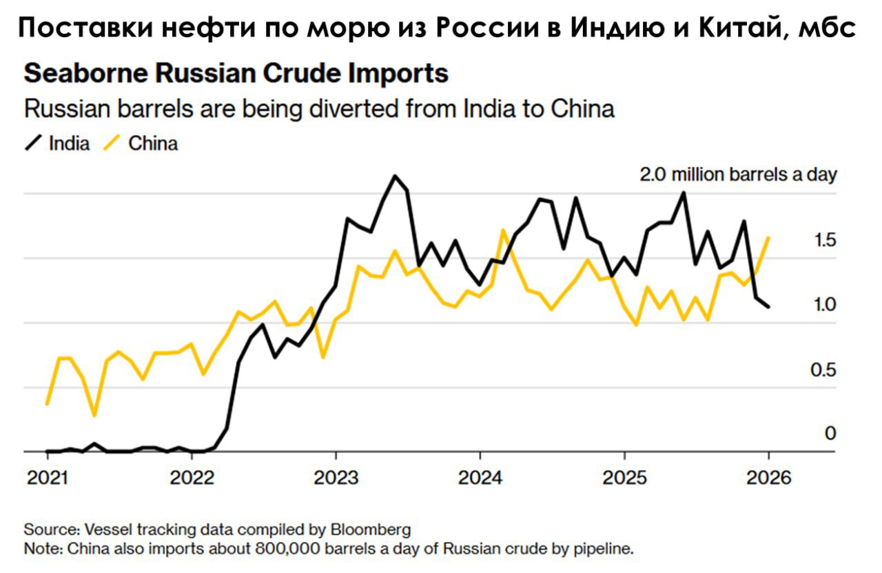 - Экспорт нефти из России в Индию постепенно снижался: с 1,8 мбс в ноябре 2025 г. до 1,2 мбс в декабре 2025 г. и до 1,1 мбс в январе 2026 г.