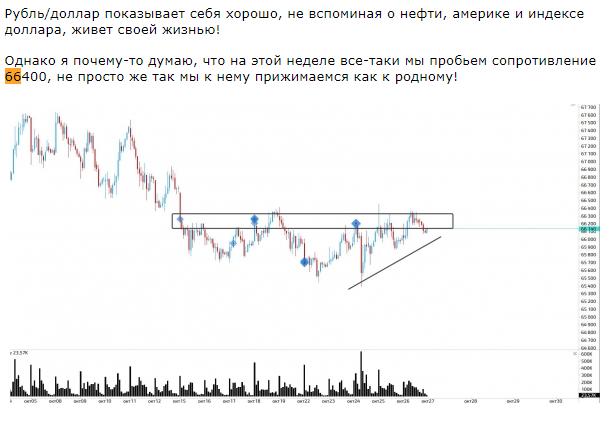 Вот и кончилась неделя! Кончилась печально, что ожидалось, но реализовалось в самый последний момент! Расторговали рубль, который прижимали к сопротивлению уже давно, помнится еще 26-27 октября на пробой все это походило! Вырезка из поста: