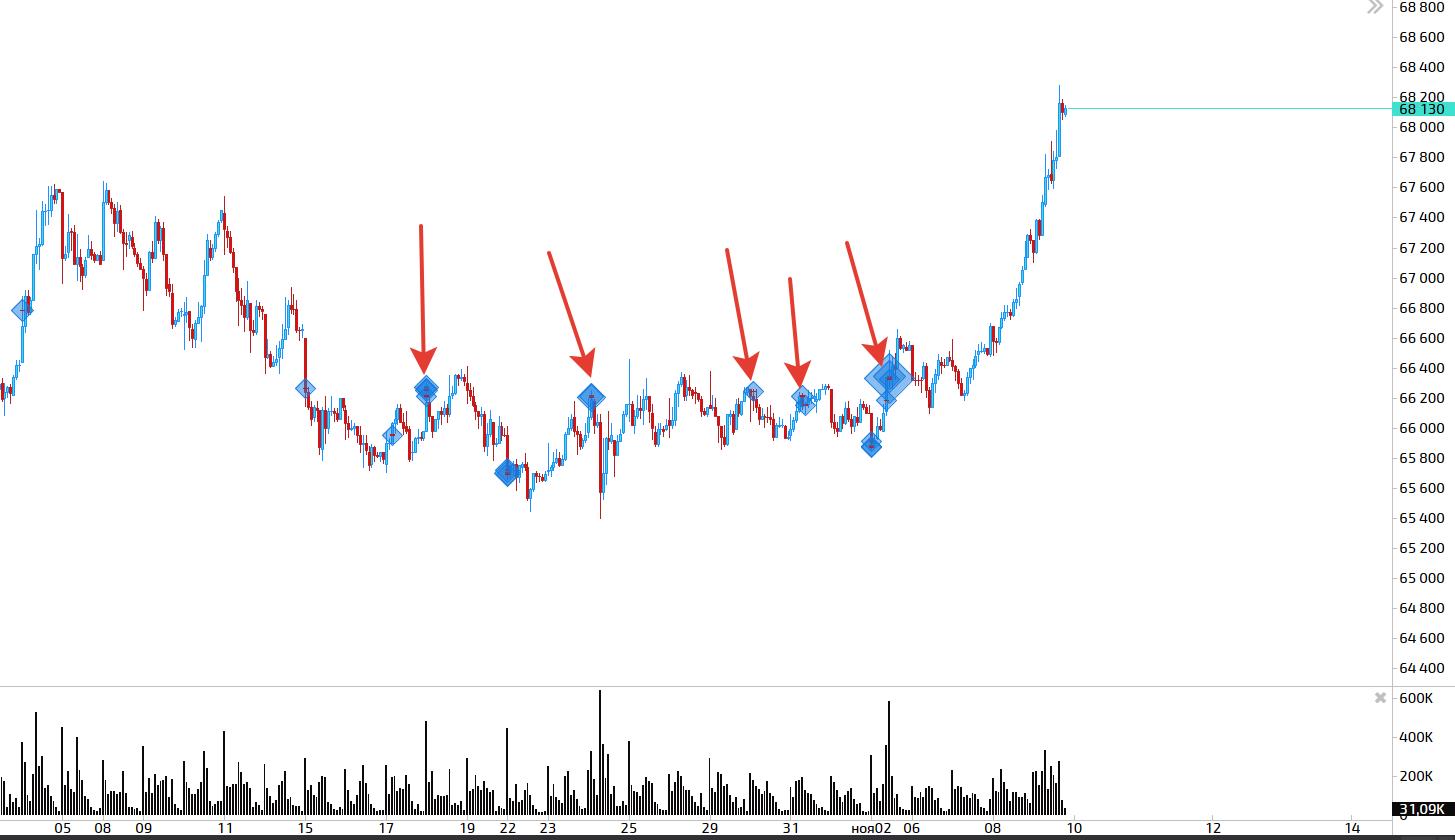 И только в прошлую пятницу цене это удалось, поэтому теперь мы видим закономерную волну покупок, судя по тому как мы прошили 67 600, идти нам на 70 000! я лично пока позиции закрыл, но буду в понедельник наверное снова открывать!