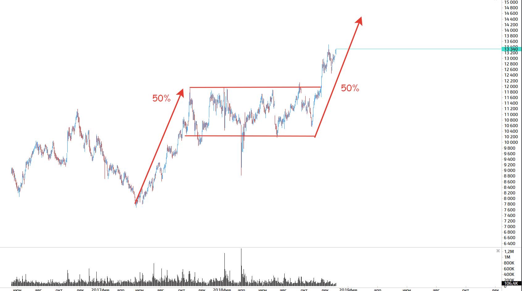 По объёму даже без кластеров видно как кто-то загружался в акцию несколько раз и с тех пор мы растем!
