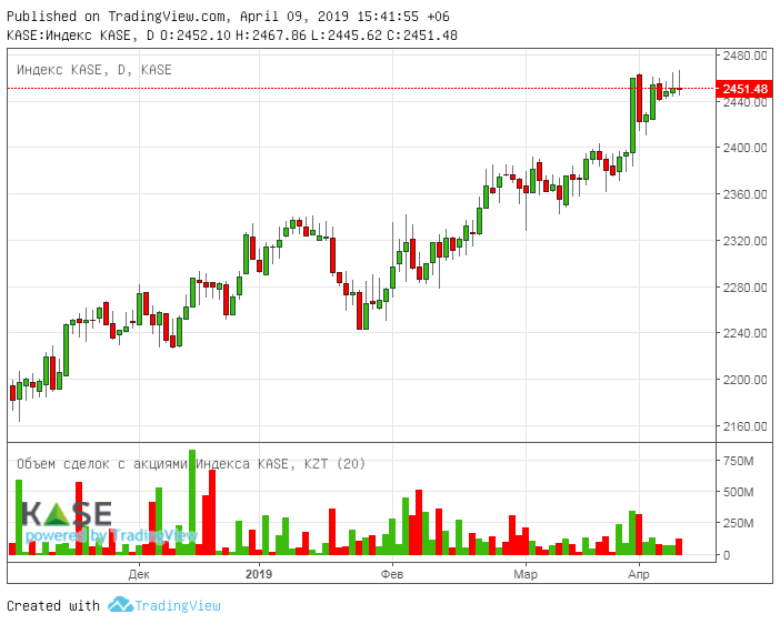 Пара USDKZT после сложения полномочий Н.А, Назарбаева с 20 марта 2019 года явно выраженной динамики не проявила. Доллар окреп с уровня 375 до 381.595 тг. 08,04,2019 вышел максимальный за почти 2 года объем по паре. Явного тренда на слом не произошло. Текущий курс 379,545 тг. за доллар. В ближайшее время валютная пара будет колебаться в своем обычном коридоре 375-382 тг. По индексу KASE 2451 изменений не произошло, лишь немногим отстает от исторических хаев в 2532 пп. До досрочных выборов 09.06.2019г. будем стоять. Вторая зависимая пара RUBKZT- 5.8591 тг. за 1 рубль. В целях развития конкуренции с российскими товарами, пара сходит выше 6. На август -сентябрь заложен еще один виток девальвации. После выборов всегда были скачки курсов валют. Из интересных историй остается лишь КТЖ, после рассмотрения ценовой политики в антимонопольном комитете РК, ждем небольшого снижения котировок. Возможно рассмотреть также АО KEGOC (Казахстанское подразделение американской AES),