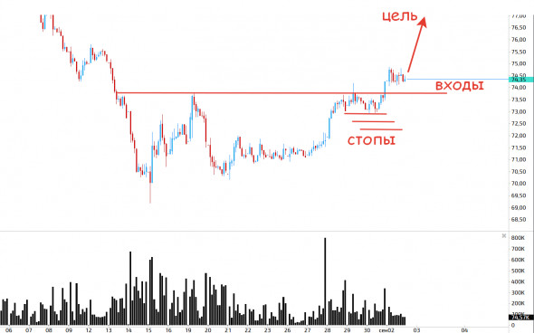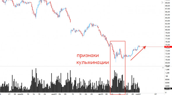 3. Алроса! У компании в этом году всё складывается плохо, спрос на алмазы упал, когда восстановится непонятно, в общем «шот побери!», «гипс снимают, клиент уезжает!», однако на графике есть признаки кульминации продаж, которые могут привести к небольшому отскоку акции в ближайшее время! Пробито локальное сопротивление 73.7 и вот его тест сверху можно попробовать покупать с небольшим стопом около 72 с копейками и целью где-то 77! Запас хода снова около 5%!