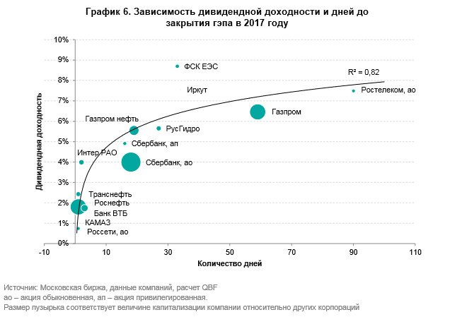 Зависимость дивидендной доходности и дней до закрытия гэпа в 2017 году