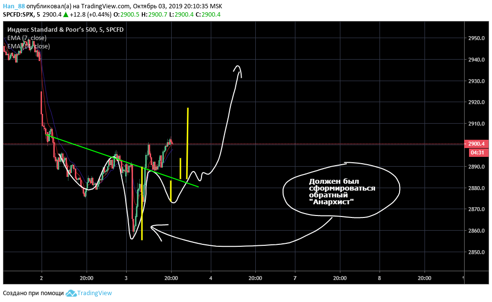 Как известно из медитаций и ТАА (Технико Апатичного Анализа), Разворот должен формироваться разворотной фигурой. Это либо «Анархист», либо «Фудзияма». В нашем случае сегодня мог сформироваться обратный микро "Анархист", на маленьком таймфрейме: