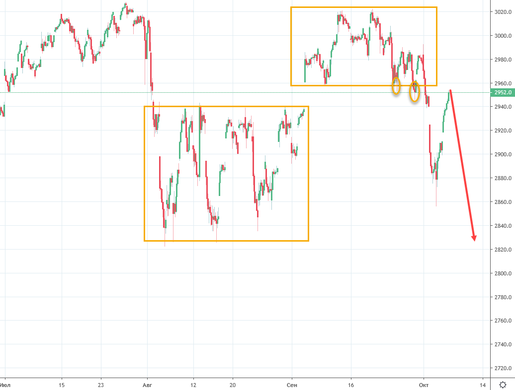 Из области 2950 - 3000 пунктов, на третий раз, сумели прорваться в 2820 - 2940. На мой взгляд, сейчас было бы логично сходить пониже и заставить ФРС начать принимать какие-то конкретные меры.
