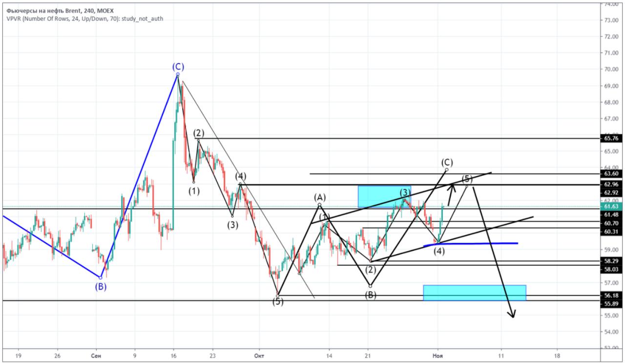Нефть. По нефти завершается коррекционная модель от снижения и как писал ранее ожидаю завершающего импульса и планирую продажи. Соответственно это мы сейчас и наблюдаем. Будет ждать завершение структуры и искать сигналы на разворот.