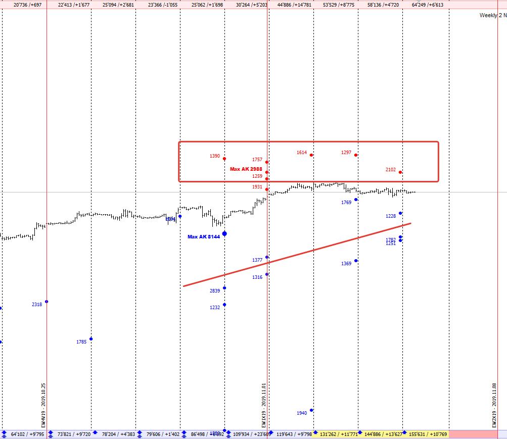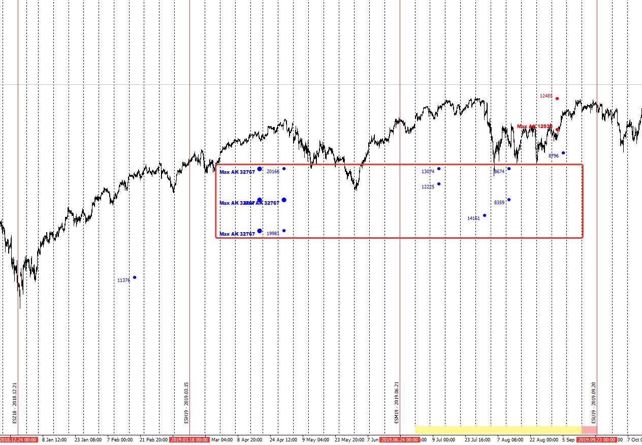 Ну и также издалека давайте посмотрим только на самые крупные объёмы, которые появляются в рынке, они на текущий момент только от покупателя, но мы подобно прошлым контрактам скорее всего в ближайшее время совершим попытку сходить на коррекцию к ним, а они уже находятся довольно глубоко, на уровнях около 2600, отрыв от них уже очень существенен, поэтому учитывая фактор набора локальных продаж, именно они могут стать драйвером глубокой коррекции на отметки ниже 2700: