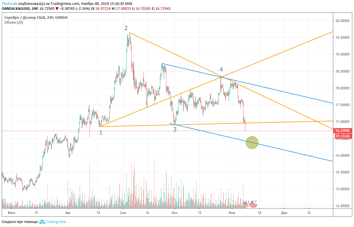 По серебру формируется потенциальный коррекционный канал. Круг соответствует возможной точке входа, которая коррелирует с точкой входа по золоту.