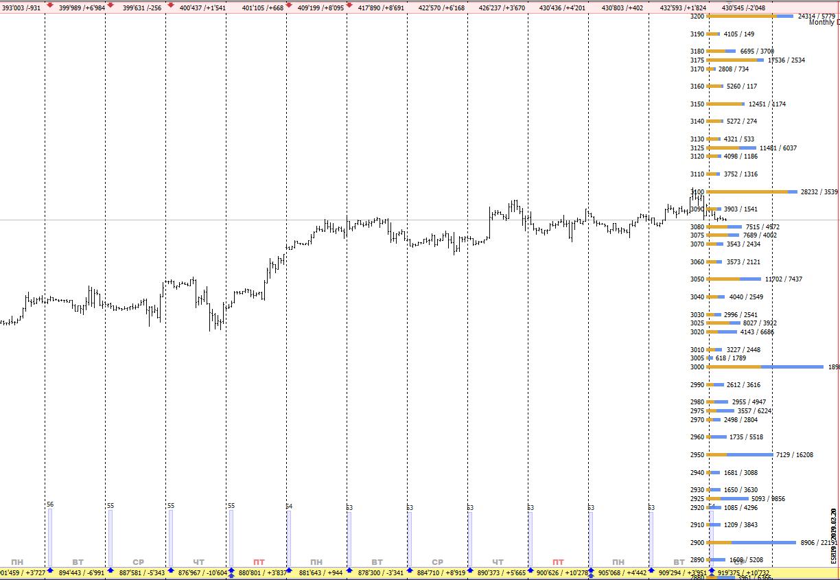Технически америка вчера снизилась, а также не менее важно что отскок произошел от уровня 3100, о нём мы много раз говорили и вот он отскок, смотрим на распределение объёма по страйкам: