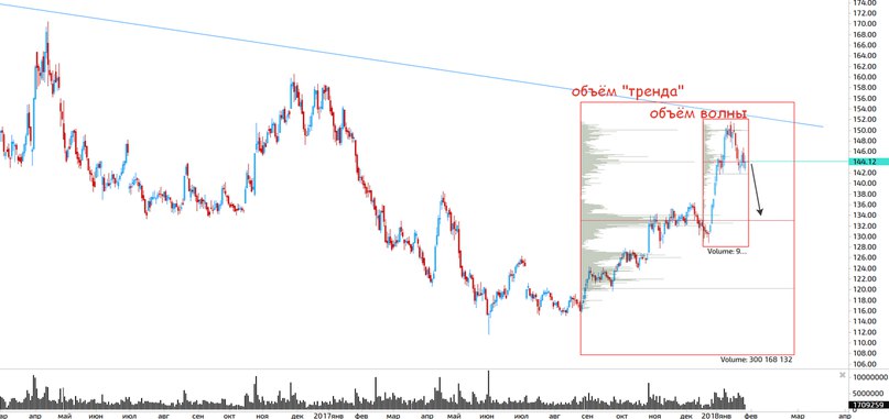 3. Газпром! Эту акцию сложно назвать фаворитом, но как мы видим здесь ситуация очень похожа на сбербанк, хотя и были намёки на рост, сейчас они кажется выдохлись. Мы подошли к сильной поддержке на которой наблюдался спрос в середине января, увидели всплеск объёма, который известил о борьбе на уровне, но уже третий подход цены к уровню не дает никаких результатов, уровень выдохся.