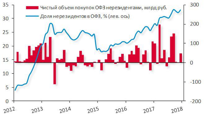 Согласно данным ЦБ РФ, нерезиденты нарастили вложения в ОФЗ на 47 млрд руб. в декабре (после сокращения на 1 млрд руб. в ноябре) до 2,23 трлн руб. При этом доля облигаций федерального займа, принадлежащая нерезидентам, выросла с 32,1% до 33,1%