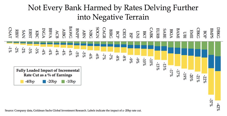 По оценкам Goldman Sachs дальнейшее снижение ставки может иметь катастрофические последствия, особенно для немецких банков. Так снижение на 20 б.п. а это фактически то что сейчас прайсят рынки на период сентябрь-октябрь должно привести к совокупным убыткам в 32 банках в размере 5,6 млрд. евро. Что может создать кассовые разрывы размерами до 6%.