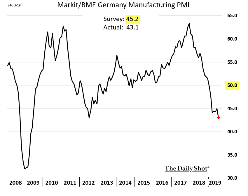 И сегодня когда у европейское экономики большие проблемы, Германия стоит на пороге рецессии, а индексы деловой активности уходят на самые низкие уровни со времён кризиса 2008 года: