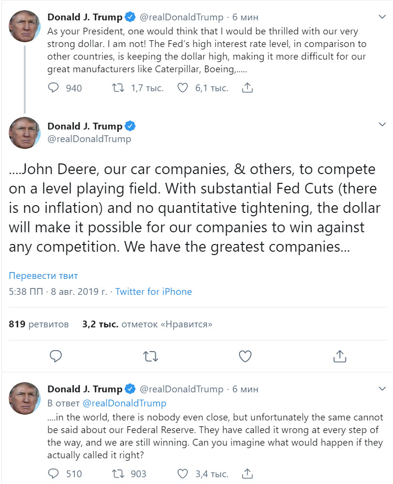 "Как ваш президент, можно было бы подумать, я буду в восторге от нашего очень сильного доллара. Но не я! Высокий уровень процентных ставок от ФРС, по сравнению с другими странами, поддерживает доллар на высоком уровне, что делает его большим препятствием для наших великих производителей, таких как Caterpillar, Boeing, John Deere, наших автомобильных компаний и других, в конкуренции на равных условиях.
