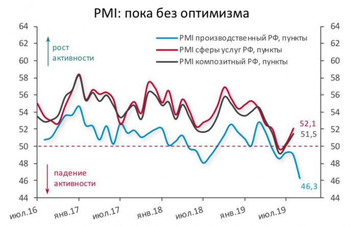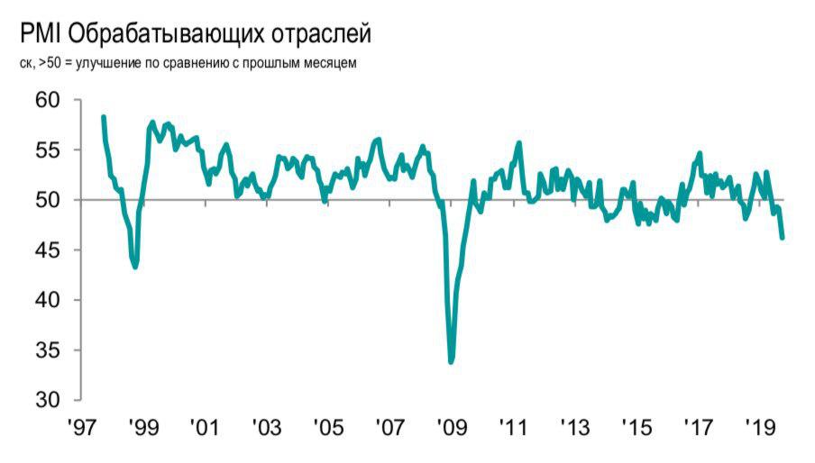 Деловая активность в обрабатывающих отраслях РФ в сентябре пробила дно. PMI Manufacturing Index упал до 46.3 пункта (значение ниже 50 пунктов - замедление активности, выше - рост). Максимальное ухудшение конъюнктуры за 10 лет.