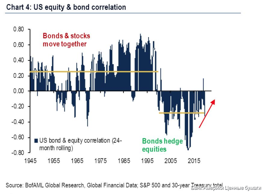 Эта абсурдная ситуация подрывает традиционные устои инвестирования по подходу 60/40 ведь «Основная предпосылка каждого портфеля 60/40 заключается в том, что облигации могут застраховать вас от рисков изменения курсовой стоимости, а акции - от инфляции, их доходность отрицательно коррелирует» говорят представители BoA. Но это предположение было верным только в течение последних двух десятилетий и было в основном ложным в течение предыдущих 65 лет. Большой риск состоит в том, что корреляция может измениться, и теперь самый длинный период отрицательной корреляции в истории подходит к концу».