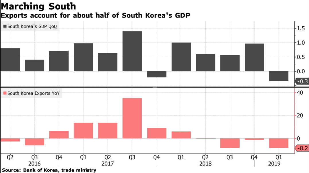 Четвёртая по величине азиатская экономика сократилась на 0,3% в первом квартале 2019 года по сравнению с кварталом предыдущим. Это заставляет экономических экспертов беспокоиться о других экспортных экономиках вроде Германии, Японии и Тайваня.