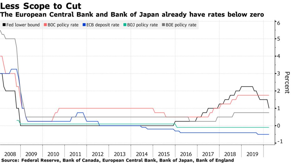 В некоторых случаях это, вероятно, отражает то, как годы радикального стимулирования оставили монетарным властям мало возможностей для более эффективных мер. До своего снижения целевая ставка ФРС была примерно на полный процентный пункт выше, чем ориентир Банка Англии. Европейский центральный банк и Банк Японии уже имеют ставки ниже нуля.