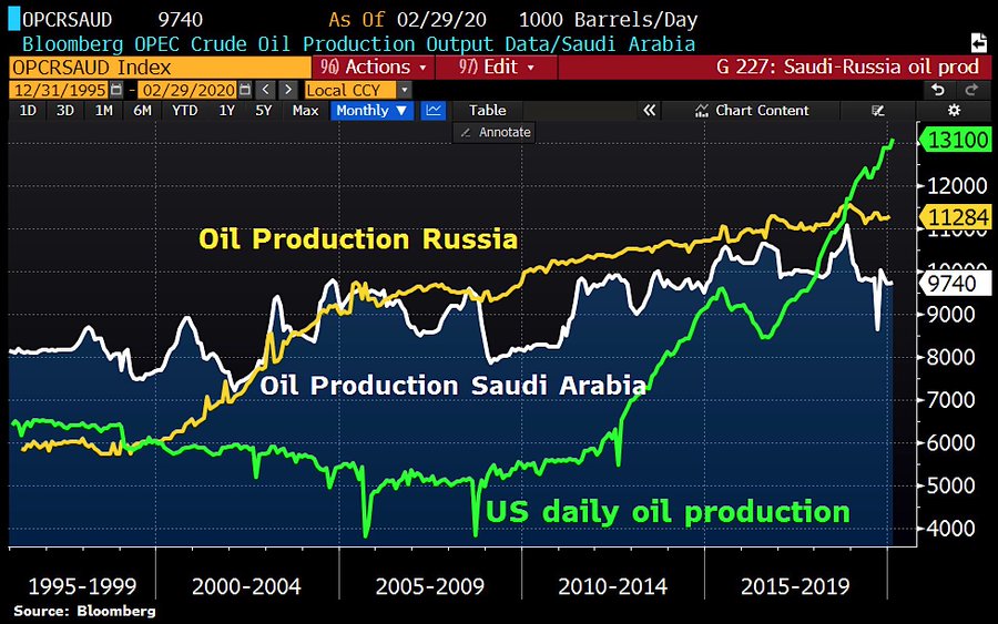 В прошлом месяце Саудовская Аравия не только осуществила сокращение объемов производства ОПЕК +, но и «добровольно» еще больше сдерживала свое производство, стремясь поднять цены. Когда срок действия соглашения ОПЕК + истечёт через три недели, Эр-Рияд сможет увеличить добычу настолько, насколько захочет.