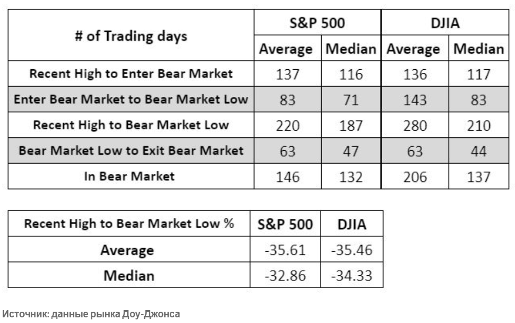В среднем, медвежий рынок для Доу длится 206 торговых дней, в то время как средний медвежий период для S & P 500 составляет около 146 дней, согласно данным Dow Jones Market Data. Dow в настоящее время упал на 20,3% с рекордных показателей 12 февраля, в то время как S & P 500 и Nasdaq составляют 19% от своих пиков 19 февраля.