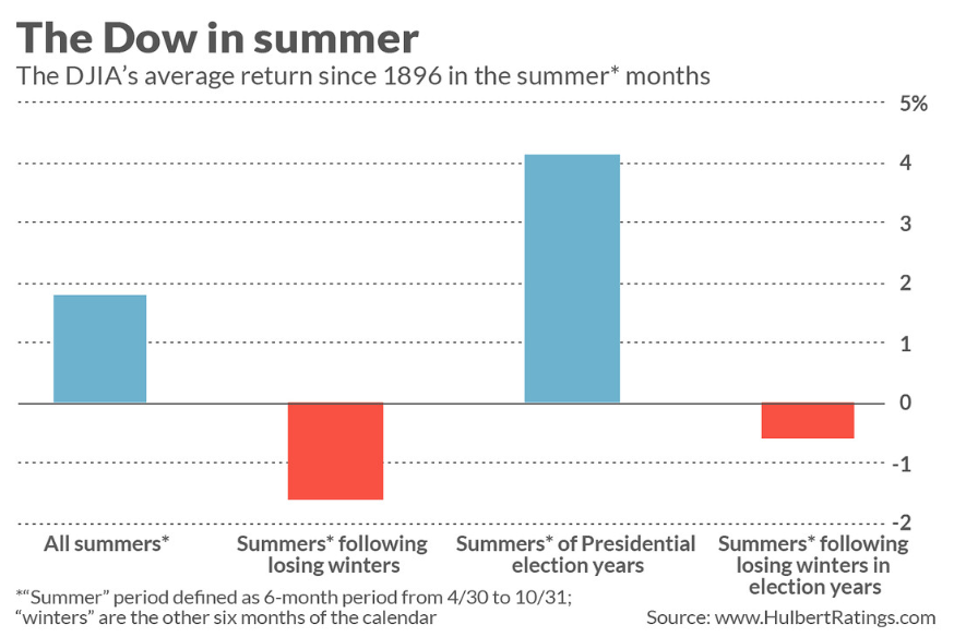Плохая новость заключается в том, что в годы президентских выборов индекс Dow снижался в летние месяцы после проигрышных зим, сообщая о средней потере минус 0,6%.