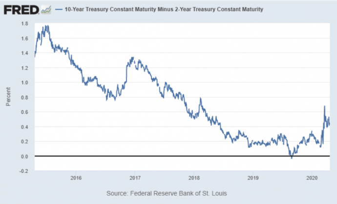 Во-первых, он утверждает, что «кривая доходности казначейства США остается слишком плоской». Кривая доходности, или спрэд между доходностью 2-летних облигаций Казначейства США и 10-летних, долгое время являлась индикатором грядущей экономической слабости или экономического восстановления, когда спред сужался или даже инвертировался до рецессий и рос до восстановления.