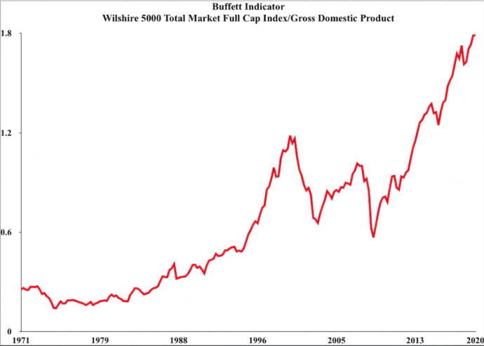 Индикатор Баффетта в четверг достиг исторического максимума , отражая быстрый отскок на фондовом рынке США после распродажи на вызванной пандемией коронавируса и спада в годовом исчислении ВВП на 4,8% в прошлом квартале . Его текущий уровень намного выше среднего значения за последние 20 лет.