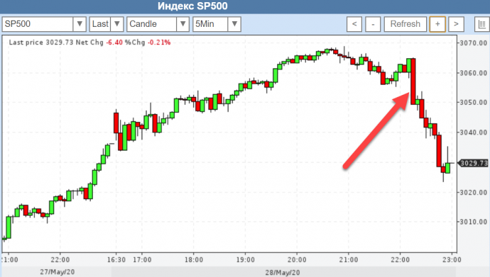 Американские акции закрылись снижением в четверг, обвалившись на отрицательную территорию в последний час торгов после того, как президент Дональд Трамп заявил, что проведет пресс-конференцию по Китаю в пятницу, что вызвало недовольство инвесторов, которые испытывали оптимизм по поводу восстановления экономики после пандемии коронавируса, начиная день с покупок американских активов.