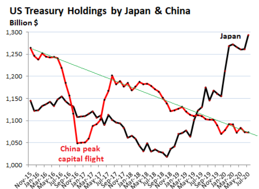 Крупнейшие иностранные кредиторы Америки, Япония и Китай: Япония увеличила свои авуары в июле на 32 миллиарда долларов, до 1,29 триллиона долларов. За 12 месяцев его авуары увеличились на 162 миллиарда долларов.
