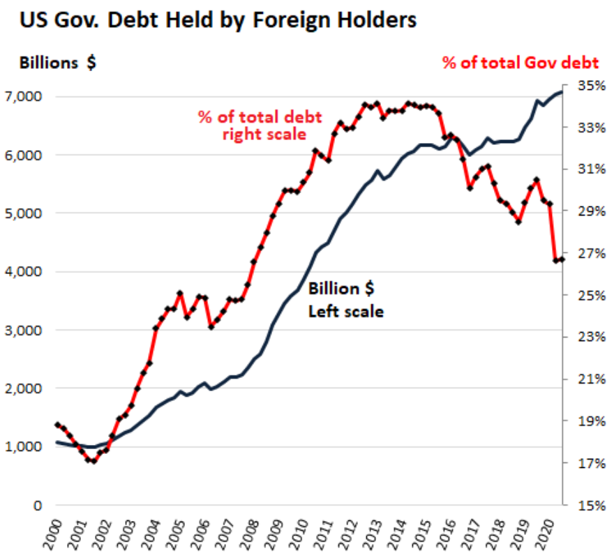 Но из-за невероятного роста государственного долга США (26,5 трлн долларов на 31 июля) их доля в этом долге (красная линия, правая шкала) показала падение в июне до самого низкого уровня с 2008 на уровне 26,7%: