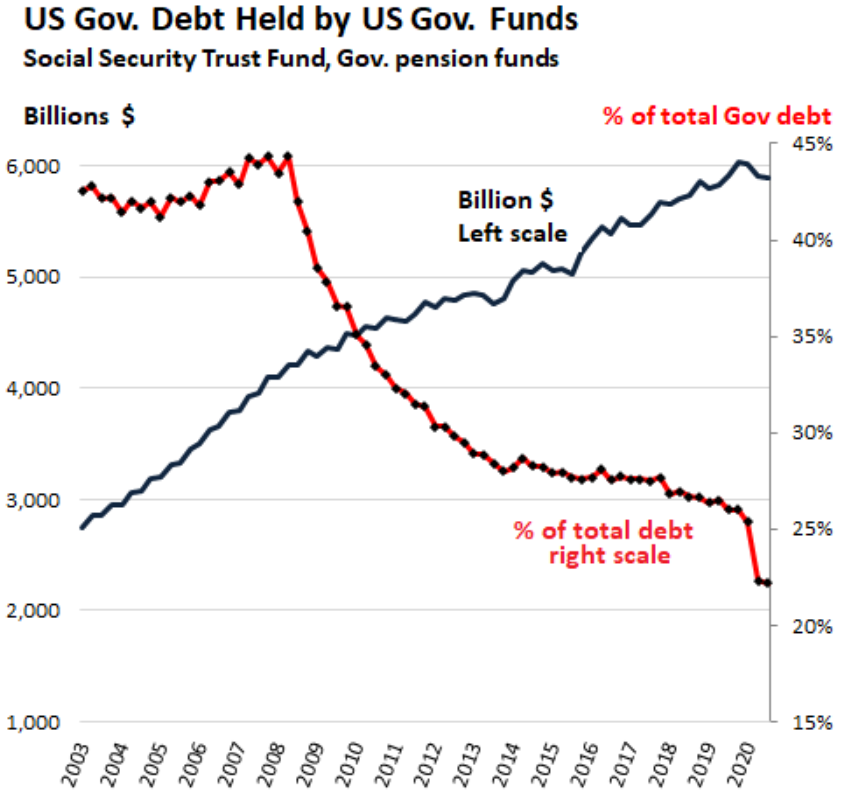 Несмотря на то, что казначейские авуары этих государственных пенсионных фондов увеличились более чем вдвое за последние 20 лет, их доля, учитывая невероятный рост государственного долга США, упала с более чем 45% в 2008 году до 22,2% в июле: