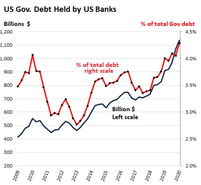 Коммерческие банки США увеличили свои запасы казначейских ценных бумаг на 66 млрд долларов в июле и на 228 млрд долларов за 12-месячный период до 1,14 трлн долларов, согласно опубликованным Федеральным резервом данным по банковским балансам, что составляет 4,3% от общей суммы долга США