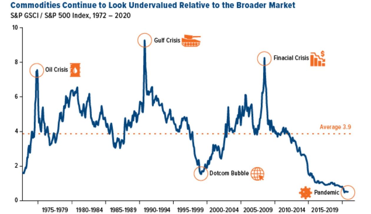 Чтобы противостоять такой слабости, Роджерс указал, что сырьевые товары, как вы можете видеть из диаграммы ниже, показывают историческую недооценённость по сравнению с оценкой акций.