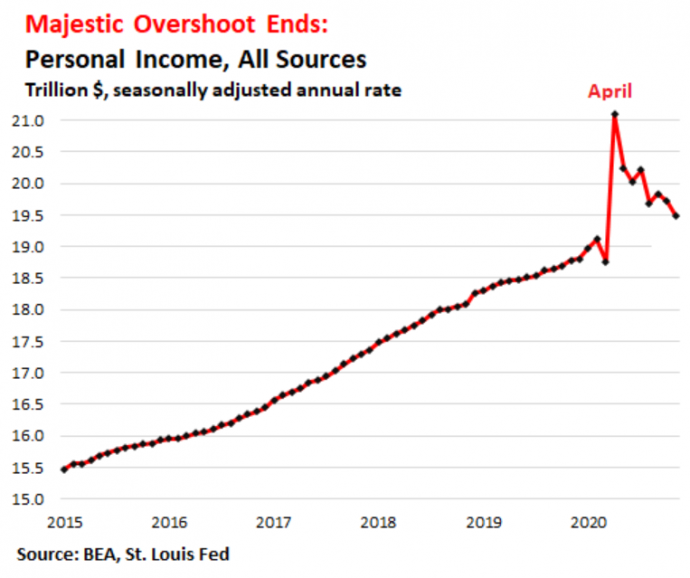 Согласно данным Бюро экономического анализа, личный доход граждан США из всех источников в ноябре упал на 1,1% с октября, до самого низкого уровня с марта 19,49 трлн долларов в год с учетом сезонных колебаний . Он упал на 7,6% по сравнению с его невероятным всплеском, вызванным стимулами и дополнительными деньгами безработным в апреле. Но это по - прежнему на 3,8% больше, чем в «Хорошие времена» год назад, сейчас, во время пандемии, когда более 20 миллионов человек все еще требуют государственных или федеральных пособий по безработице. Смотрите первый график в статье.