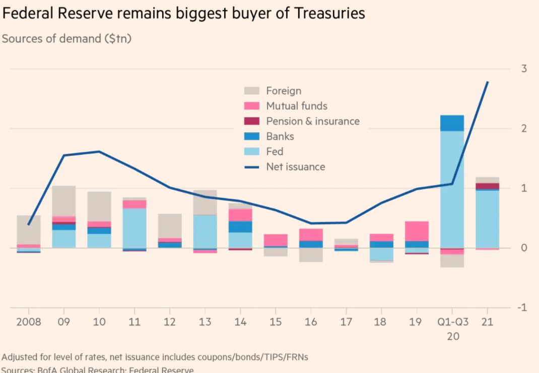 Банки стали еще одним важным покупателем казначейских облигаций, но их деятельность на рынке также может быть более ограниченной. Регулирующие органы США должны до конца месяца решить, следует ли продлить временное изменение правил на так называемый коэффициент дополнительного левериджа (SLR), который позволяет банкам исключать казначейские обязательства и денежные резервы при расчете того, сколько дополнительного капитала им необходимо держать. Эта политика была введена в действие в апреле 2020 года отчасти для того, чтобы побудить банки более решительно вмешаться для стабилизации волатильных рынков.