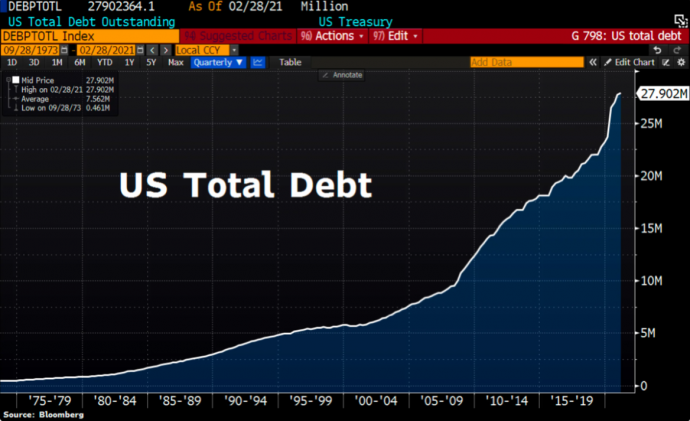 В последнее время, очень много разговоров в среде аналитиков о том, что долговая нагрузка Соединённых Штатов растёт с сильным ускорением, особенно после того, как американский конгресс принял очередную программу стимулов на 1,9 трлн долларов, которая будет финансироваться фактически за счёт долговых казначейских обязательств США.