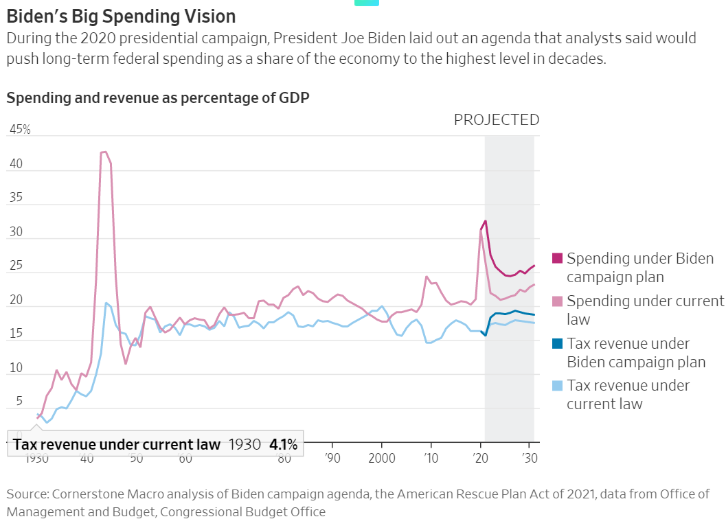 Закон о стимулировании экономики Байдена увеличил федеральный долг, который уже достиг рекордов мирного времени при Трампе. Г-н Байден сказал, что его программа в конечном итоге будет направлена на ограничение государственных займов за счет повышения налогов и экономии медицинских расходов.