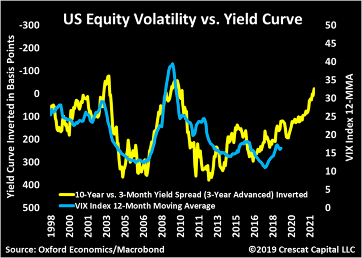 Другой способ взглянуть на инверсии кривой доходности - отследить их как опережающий индикатор против волатильности капитала. Обратите внимание, насколько близко волатильность следует за инверсиями доходности с временным лагом. Рост волатильности акций, с недавней тенденцией к повышению минимумов, является одним из всадников апокалипсиса от Кэма Харви.