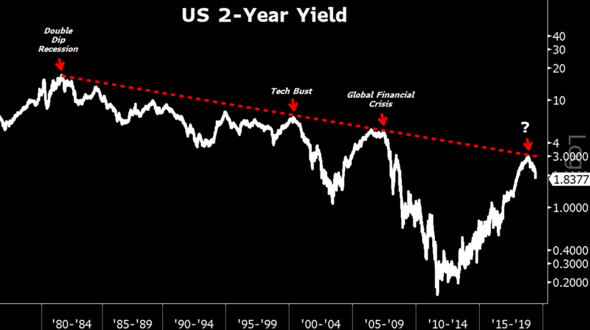 Годовое ралли в американских акциях было полностью отвергнуто 2-летними доходностями, которые непрерывно снижались с ноября 2018 года. Один из этих показателей ошибается. Переход к смягчению денежно-кредитной политики в конце делового цикла, когда существует падение доходности за 2 года, всегда был очень медвежьим.