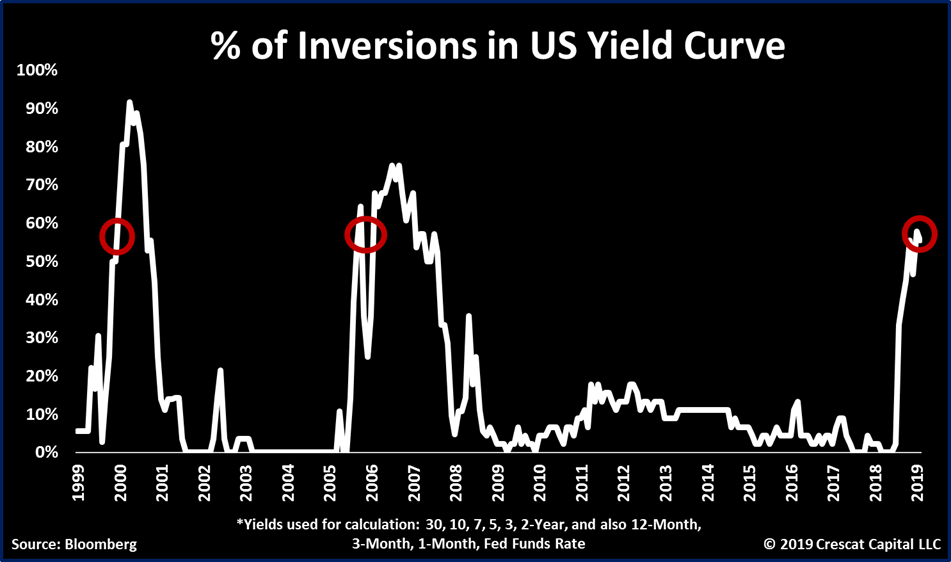 Множество инверсий кривой доходности есть не только в США, но и во всем мире. Исторически все они были надежными макро-предупреждающими сигналами о предстоящей рецессии. Число этих инверсий кривой доходности продолжает расти. Основываясь на работе Тави Косты, рекордные 16 стран теперь имеют 30-летние облигации с доходностью по ставкам овернайт ниже LIBOR, экстремально перевернутой «глобальной» кривой доходности, аналогичной той, которая предшествовала двум последним глобальным рецессиям. Также, основываясь на работе Тави, процент инверсий кривой доходности в избранных странах с высоким риском является пугающим: Гонконг (79%),