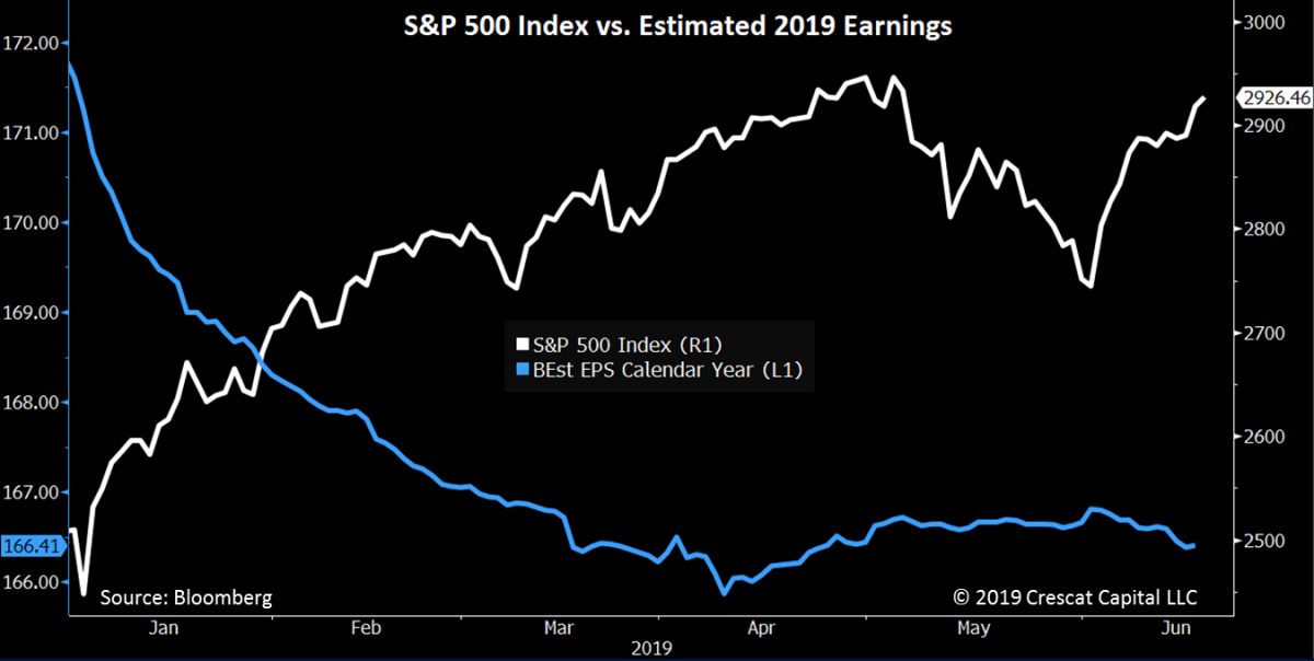 Обратите внимание на расхождение челюстей аллигатора на графике ниже между S&P 500 и его ожидаемыми доходами на 2019 год. Ожидаемый доход на 2019 год уже резко снизился в первом квартале и снова начал снижаться после эскалации торговой войны в мае.