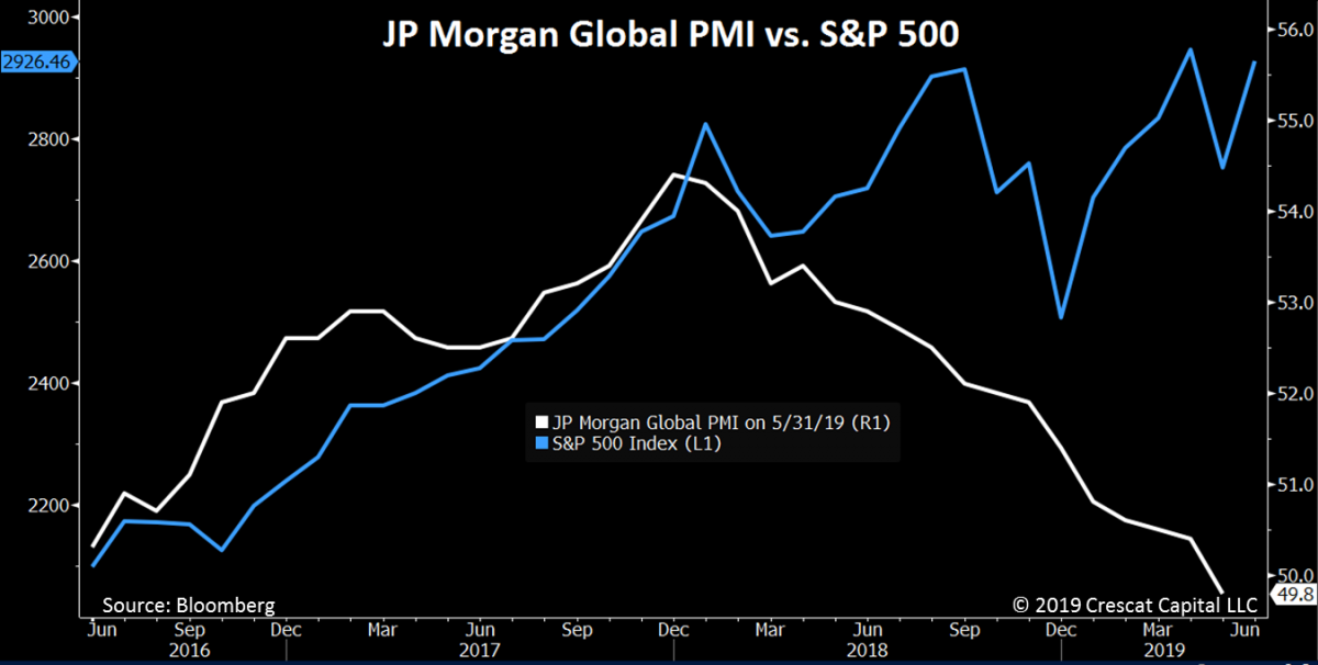 Не только условия в США, но и глобальные экономические условия быстро ухудшались в 2019 году. Сейчас в около 60% стран индексы менеджеров по закупкам находятся ниже 50, согласно исследованию Morgan Stanley, что указывает на то, что мир приближается к рецессии. Аналогичным образом, после неуклонного снижения с января 2018 года, мировой индекс деловой активности в производственном секторе JP Morgan упал ниже 50 в мае, указывая на то, что глобальная рецессия, возможно, только началась.